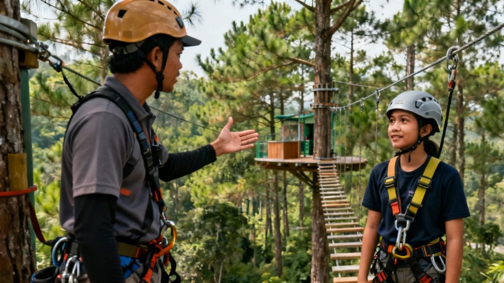 Flying fox termasuk kegiatan outbond yang cukup populer dan memacu adrenalin.