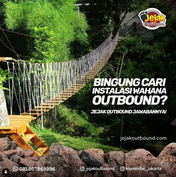 Informasi Jasa Instalasi Outbound : jejak outbound adalah jasa yang menyediakan layanan untuk membangun atau menginstalasi permainan-permainan untuk outbound. Permainan outbound biasanya merupakan permainan outdoor yang menyatu dengan alam. Kini peminat dan penggemar kegiatan outbound pun merebak di berbagai daerah.